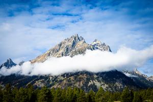 Morning fog burning off and clouds still hanging on the Tetons in Wyoming